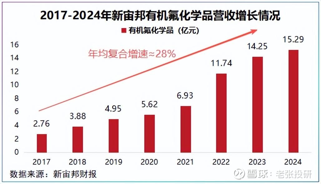 技术、客户、市场份额三大护城河下,公司有机氟化学品实现七连增,从2017年的2.76亿元增长到了2024年的15.29亿元,年均复合增速约28%。