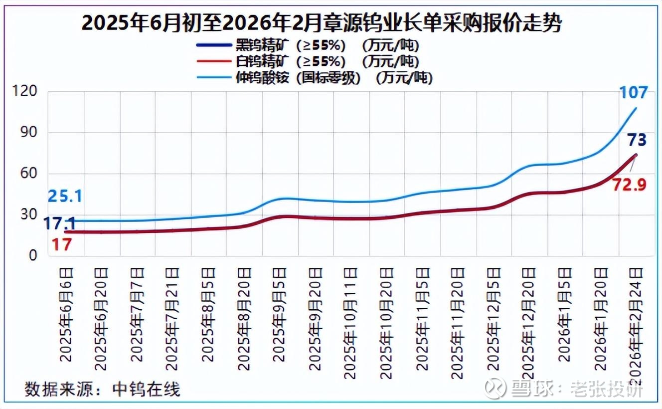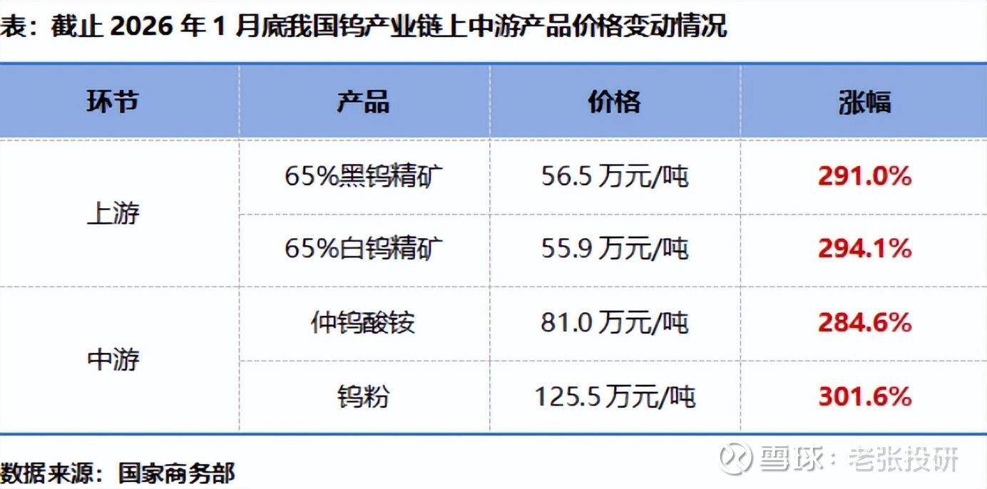 上游、中游产品亦是如此,截至2月24日,公司仲钨酸铵、≥55%黑钨精矿、≥55%白钨精矿较2025年6月初涨幅均已超320%。