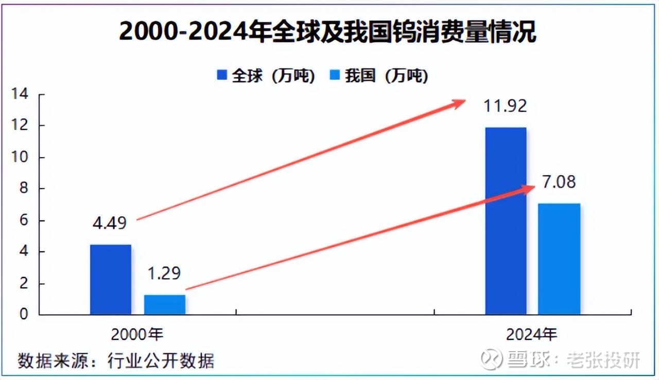 前面直播中,我们提到过,2000-2024年,全球钨消费量从4.49万吨增至11.92万吨,增幅高达1.65倍,我国消费量则从1.29万吨增至7.08万吨,增幅更是达4.49倍,显示出需求的紧迫。