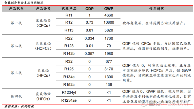 根据ODP值(消耗臭氧潜能值)和GWP值(全球升温潜能值)进行环保程度评估,氟制冷剂经历了四代迭代。