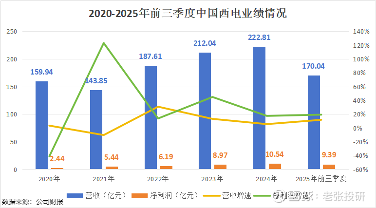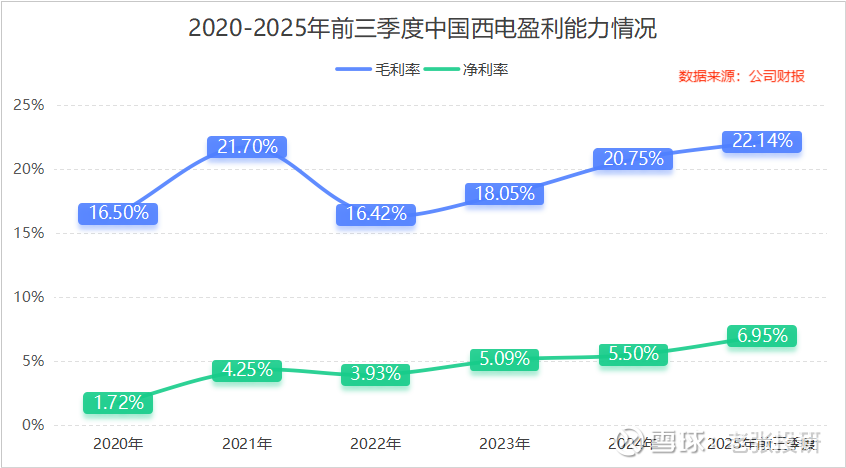 2020年-2025年前三季度,中国西电的毛利率从16.5%提高至22.14%,净利率也从1.72%大幅上涨至6.95%。