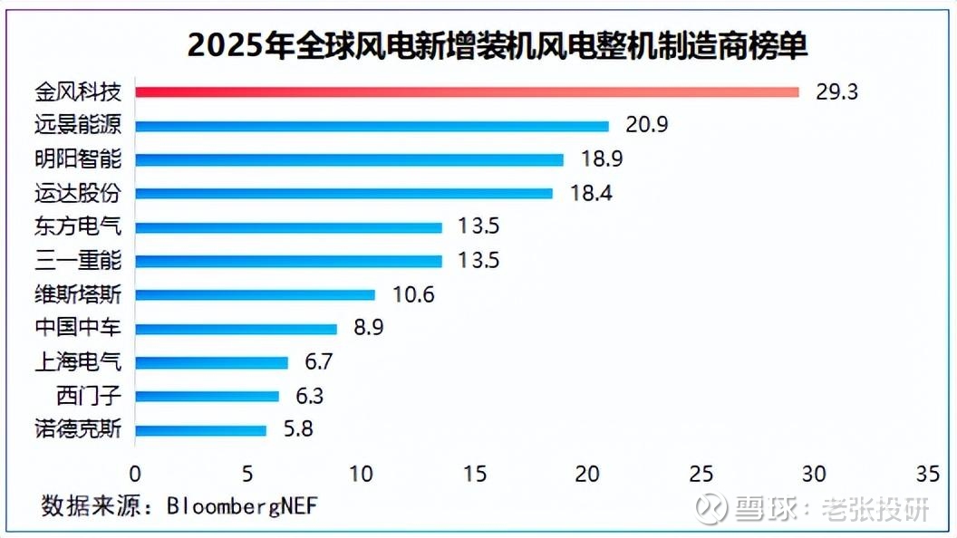 2025年,金风科技新增装机29.3GW,同比增幅达51.81%,继续保持全球第一大风机制造商的地位,远景能源以20.9GW位居全球第二,明阳智能紧随其后。