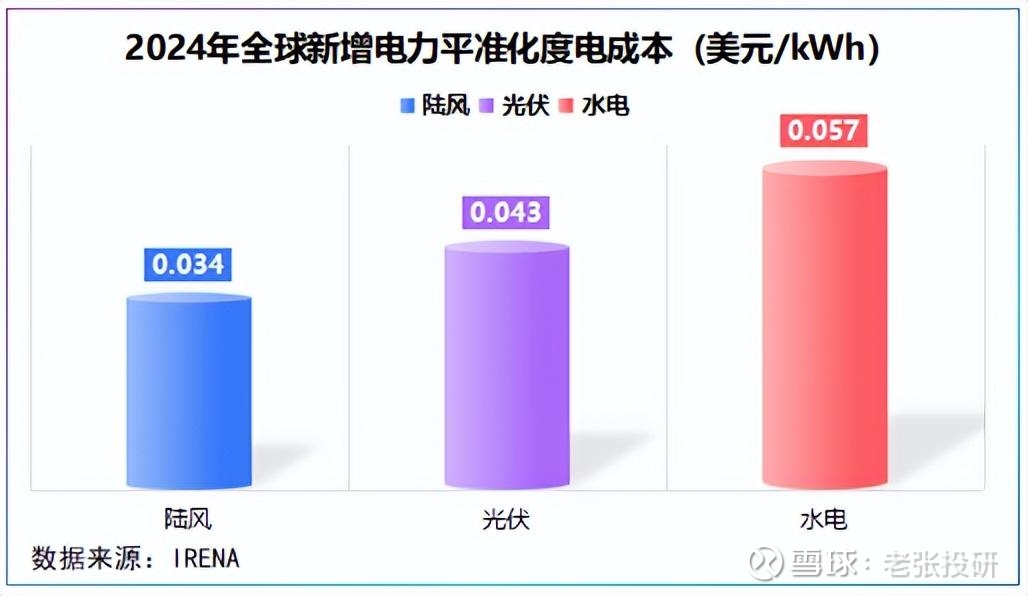 2024年,全球新增电力中,陆上风电平准化度电成本仅为0.034美元/kWh,明显低于光伏(0.043美元/kWh)和水电(0.057美元/kWh)。