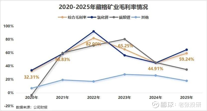 2024-2025年,藏格矿业氯化钾业务的毛利率从44.83%上升到64.64%,带动公司整体毛利率从44.91%上升到59.24%。