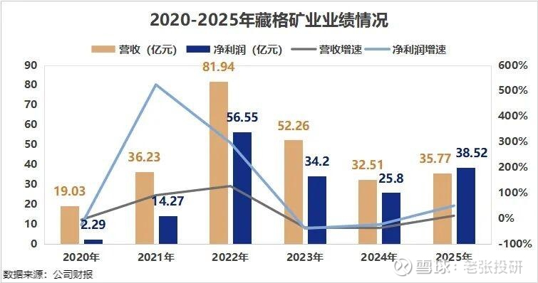 2025年,藏格矿业实现营收35.77亿元,同比增长10.03%;净利润却高达38.52亿元,同比增长49.32%。