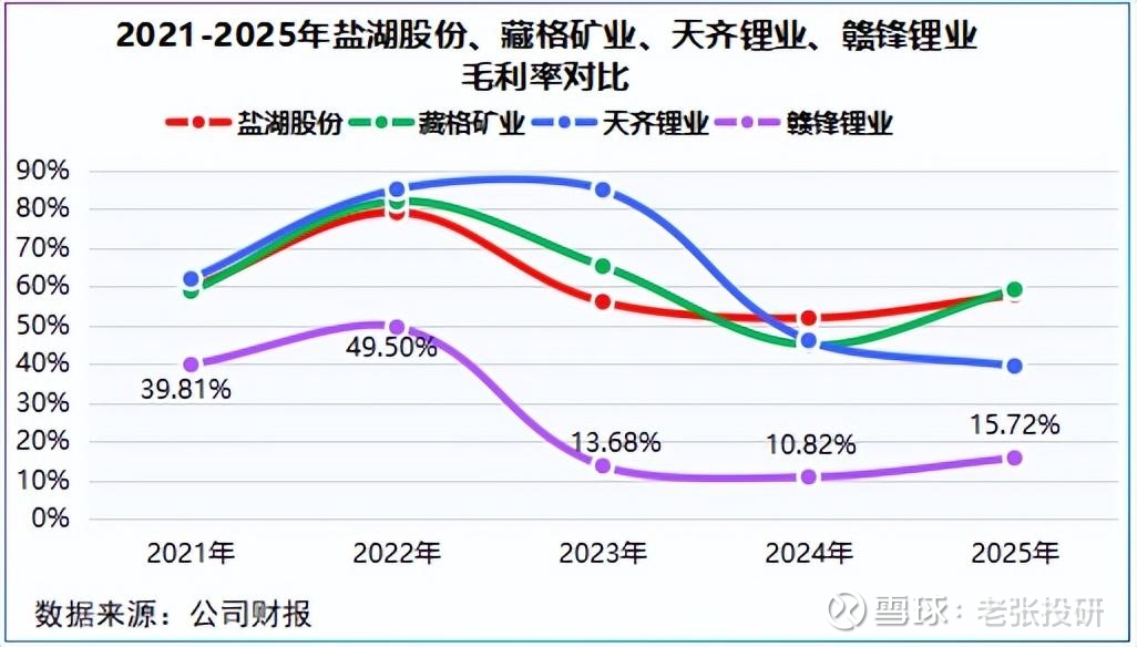 毛利率的差异更是两极分化,2021-2025年,天齐锂业、藏格矿业、盐湖股份年均毛利率均在60%以上,赣锋锂业不到三者的一半。