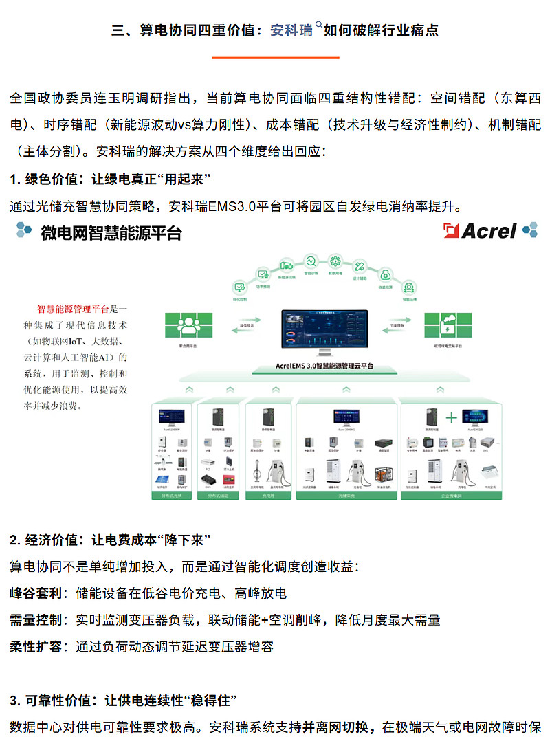 算电协同四重价值:安科瑞如何破解行业痛点安科瑞凭借完整的“云-边-端”产品矩阵——从AMB智能小母线、AMC精密配电装置,到新能源系统,再到数据中心能效监控管理系统——为数据中心提供了算电协同落地的技术路径。