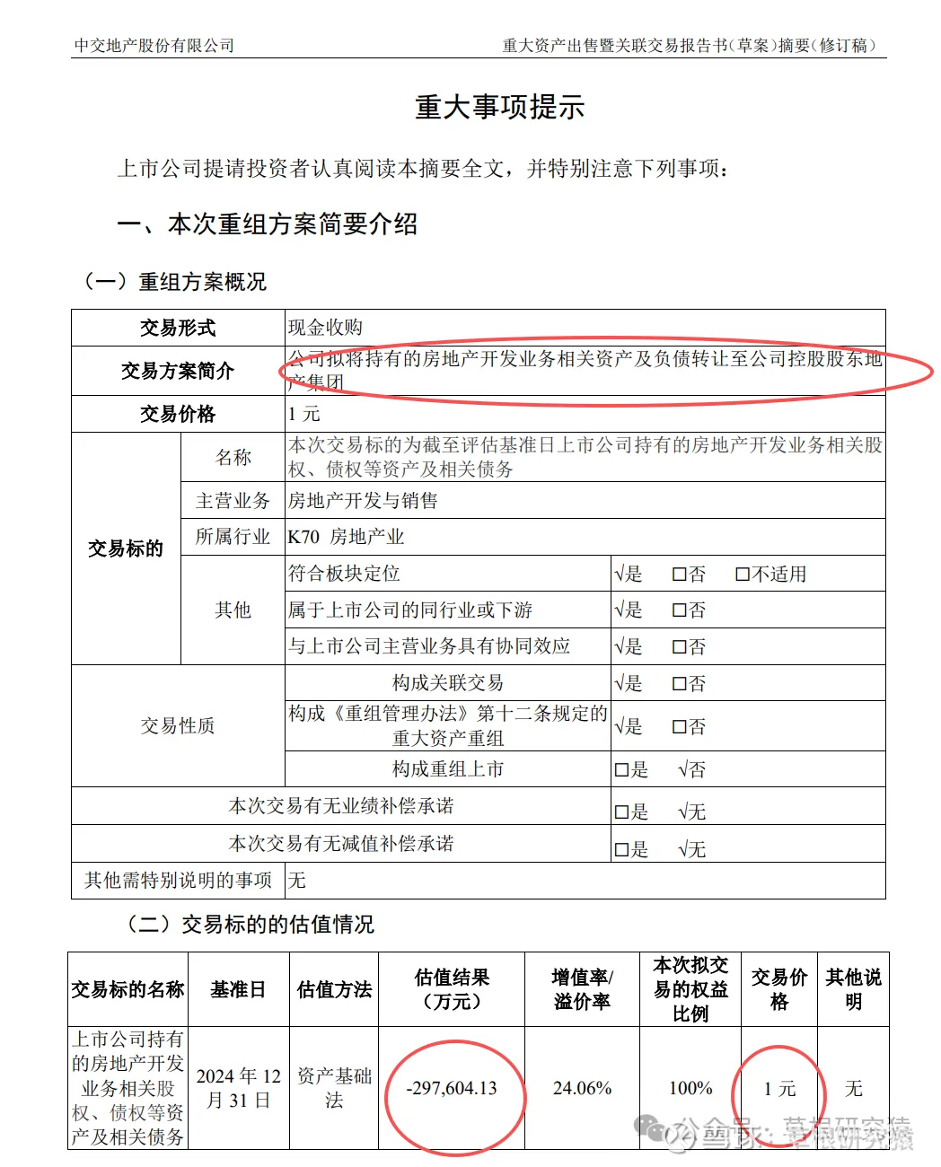 主要是在今年7月25日的时候,将亏损近三十亿的资产关联交易给了控股股东,中交地产集团,交易价格是1块钱。