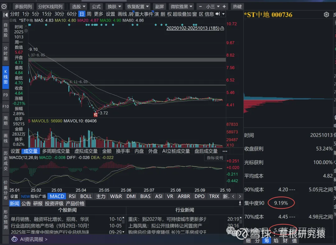 其实最开始这双雄,我更看好的是中地,因为中地调整的幅度够大,从高位的13-14元直接到了3-4元,跌去了75%。这种幅度想必有很多人被套,起码得自救下吧,拉升拉升。结果,它从4月一直躺平到了现在,已经躺了六个月,快半年了。按理说主力吸筹的时间半年足够了,该动动了吧(好吧,只是意淫一下)。