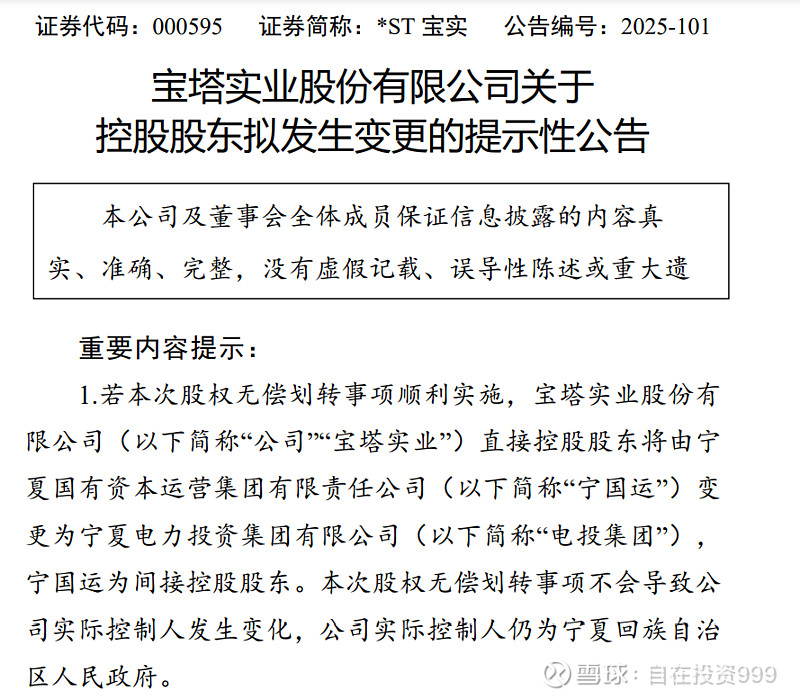 2025-8-13收到控股股东宁国运发来的 《关于股权无偿划转的告知函》,为进一步整合宁国运能源 板块,推进新型能源体系建设、实现资源优化配置,宁国运拟 将持有的宝塔实业 206,896,551 股 A 股流通股份(占宝塔实 业总股本比例为 18.17%)无偿划转给电投集团。
