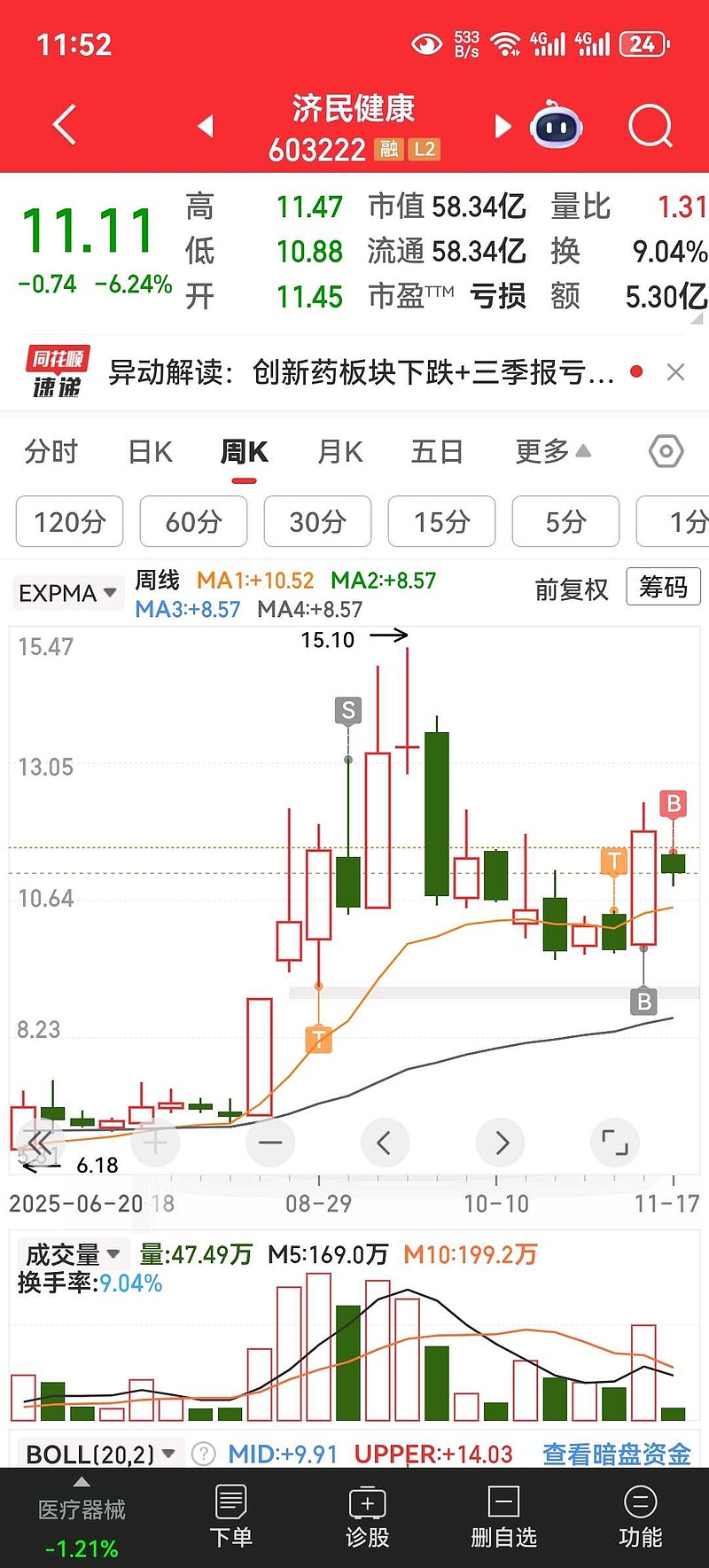 $济民健康(SH603222)$ :2025年9月26日,济民健康控股子公司海南济民博鳌国际医院有限公司收到CDE签发的临床试验申请受理通知书,受理号为CXSL2500840。根据规定,需在60日内未收到否定或质疑意见后方可开展临床试验。 预计11.24-25日出公告值得埋伏博弈,另外海南封关12.18日整体海南板块指数持续创新高走势较强,个股轮番启动,济民昨日试盘今日是突破60日线首次回踩,收盘不破可继续加仓…周线级别上看的更清楚,上周放量突破下降通道,老鸭头雏形已成,大c浪运行中如基本面配合申请通过,破前高指日可待。此股题材众多又是海南唯一民营医院,定有资金相中,但股性波动很大,上车请系好安全带![]()