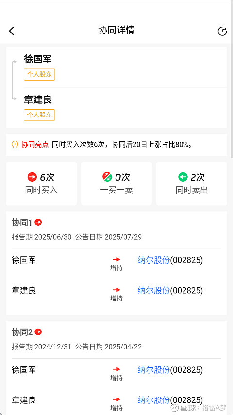 个人股东徐国军、章建良携手最新操作纳尔股份!二人历史发生6次同时买入操作,操作后20日内股价上涨占比达80%!之前5次同时买入后,4次股价就明显出现上涨情况,而看了下这次的数据,二季度操作后确实出现显著上涨,7月中旬实现超10%的涨幅,不过此次行情不知道还能不能再加把劲!$纳尔股份(SZ002825)$