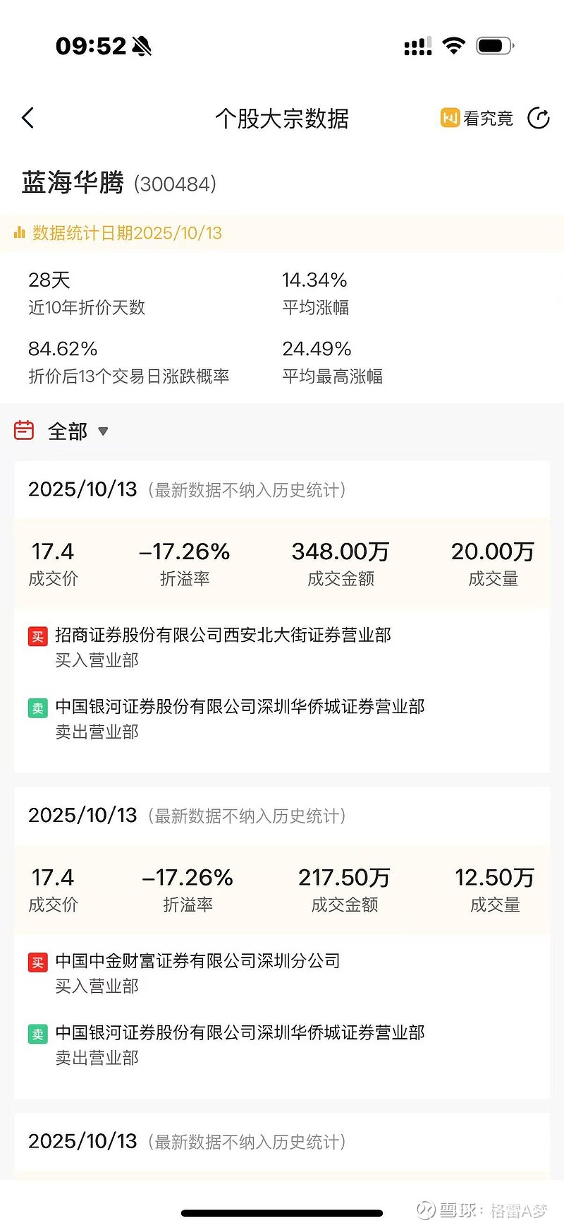 昨天完成多笔大宗交易,数量不算多但是折价率挺高的,83折,但这票历史发生折价交易后,通常股价上涨的概率反而大,今日的行情似乎也印证了这个