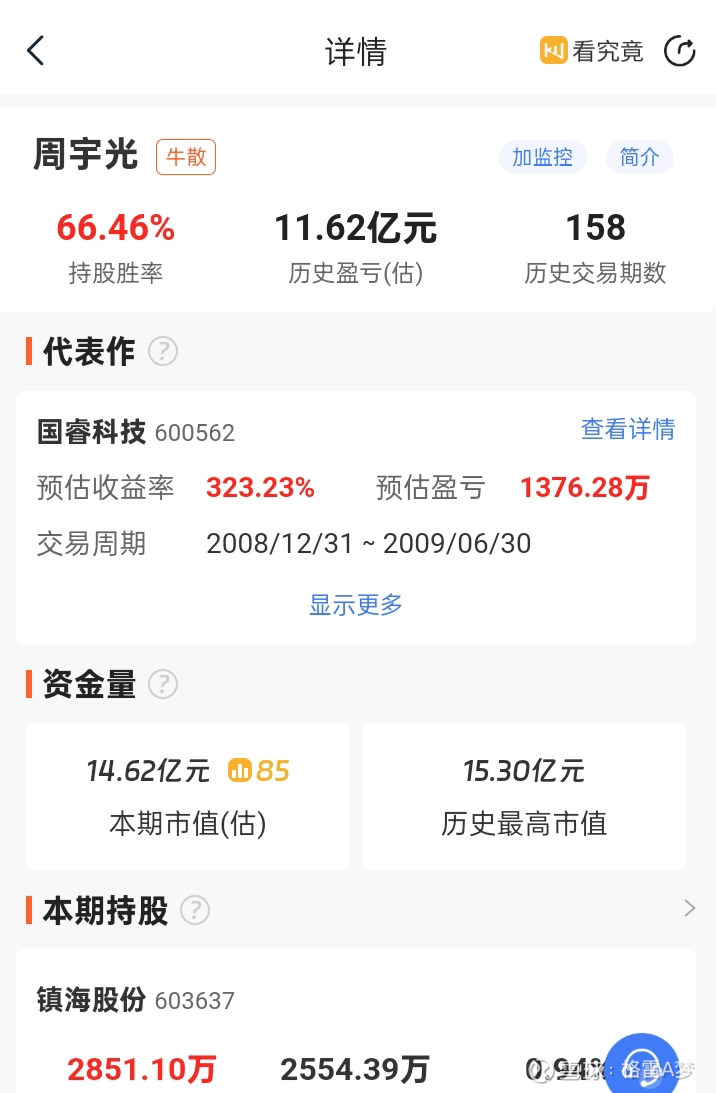 细看周宇光的持股地图,不难发现他专攻20-30亿市值的小票,这类股重组预期强、波动大,最适合快进快出。从国睿科技到美年健康,再到如今的翠微股份,他总能在消息落地前精准卡位,复牌大涨后迅速兑现,节奏稳得让人眼红。