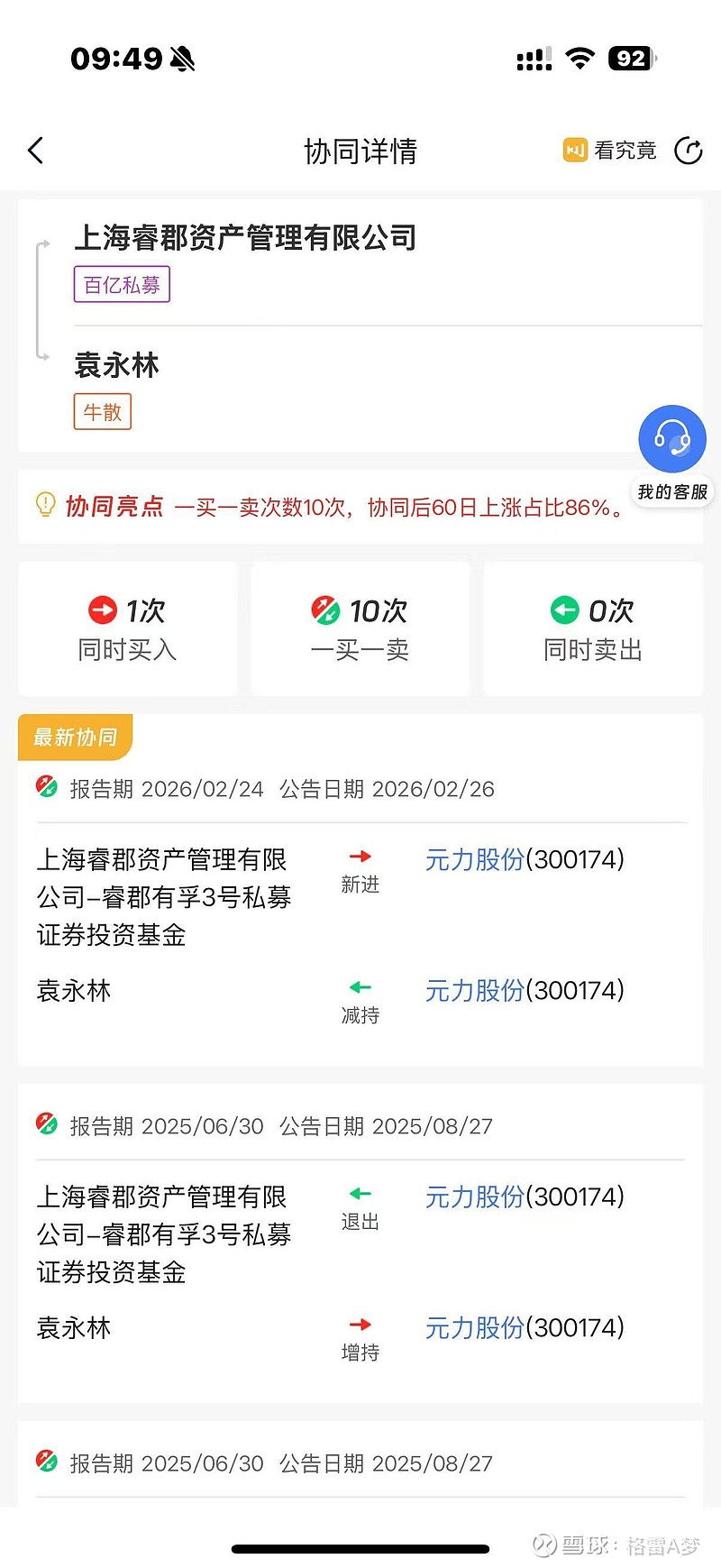 睿郡资产最新和袁勇林又发生新协同,这二者一买一卖个股的事情已经发生10次了,且发生后60个交易日内上涨占比极高,此次也对