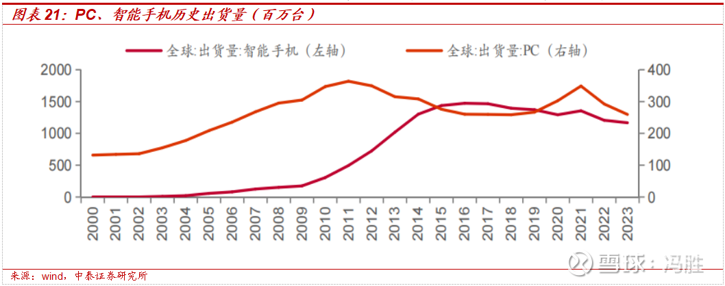 ◼ 1)PC时代( 1998-2009):受益于互联网、CPU的发展,此阶段PC的出货量快速提升,2000年全球PC出货量为1.32亿台,2009年超过3亿台,CAGR为9.8%;