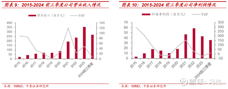 ◼2015年至今公司营业收入持续、快速增长。2015-2023 年,公司持续开拓市场,扩大收入规模,营业收入持续、快速上升,营业收入从0.23亿元增长至3.54亿元,复合增速达到 40.9%,归母净利润从326万元增长至4306万元,复合增长率为38.1%。根据公司2024年业绩快报,预计2024年营业收入为3.77亿元,同比+6.53%,归母净利润为0.48亿元,同比+10.35%。