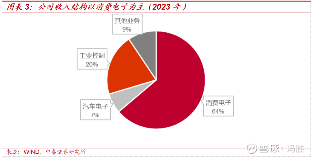 ◼ 公司下游以消费电子为主,占比达64%。根据下游分类,公司收入结构主要分为消费电子、工业控制、汽车电子,2023年占比分别为64%、20%、7%。