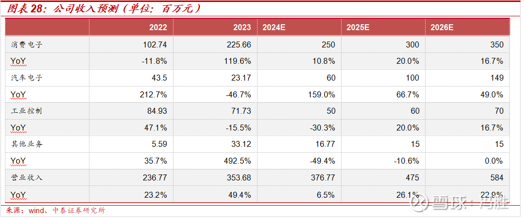 2、汽车电子:汽车电子是公司未来发展的重点方向,但收入体量相对较小,因此预计增速将保持较高增速,预计2024-2026年增速分别为159%、66.7%、49%;