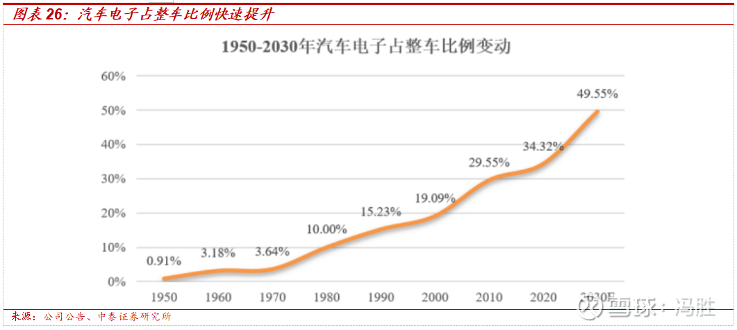 ◼ 汽车电子是汽车车体电子控制装置和车载电子控制装置的总称,按应用领域可以分为汽车电子控制系统和车载电子电器等。随着信息技术的飞速发展,汽车行业与互联网行业的整合速度进一步加快,汽车从功能性向智能化发展过程中,已由单纯的机械产品转变成机电一体化产品,汽车电子在整车制造成本的占比不断提升。在互联网、娱乐、节能、安全四大趋势的驱动下,汽车电子化水平日益提高。根据中商产业研究院数据,2020 年汽车电子占整车成本比例为 34.32%,到 2030 年有望达到 49.55%。