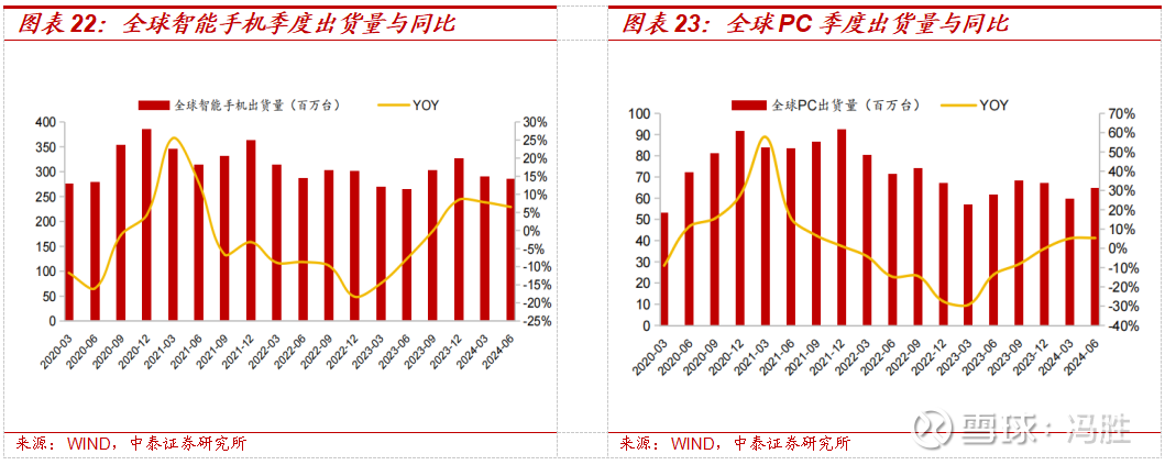 ◼ 1)手机:根据Wind,2023年Q4全球智能手机出货量为3.26亿部,同比+9%,基本恢复到2021Q3的水平;2024Q2全球智能手机出货量为2.85亿部,同比+7%;