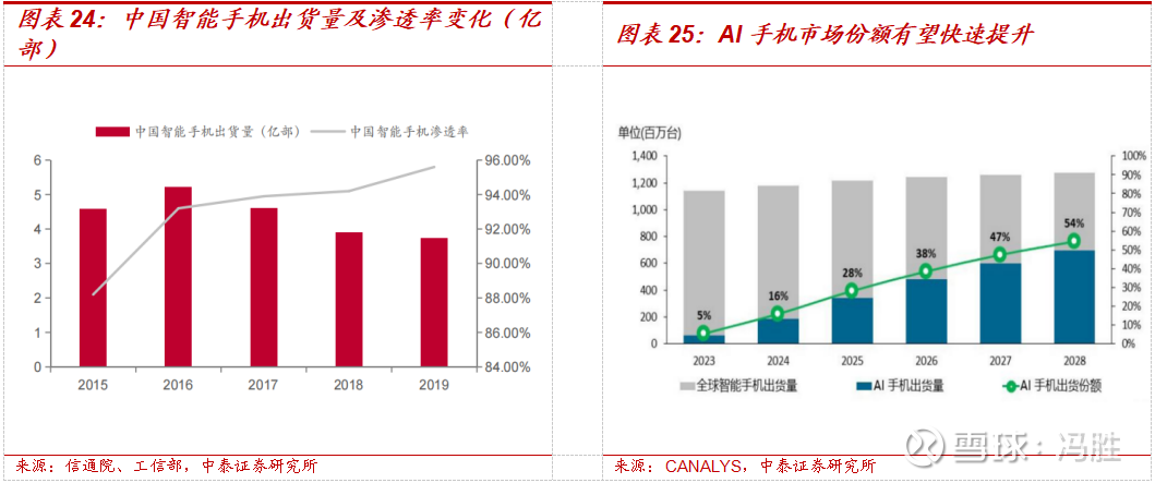 ◼ 参考智能手机演化路径,AI手机渗透率有望快速提升。随着大模型技术迅速发展,引发智能移动终端的交互变革,各类手机进入Al时代。根据Canalys,2023年AI手机市场份额约5%,预计到2028年全球AI手机累计销售量将超过10亿部,AI手机将占全球智能手机总出货量的比重超过50%。