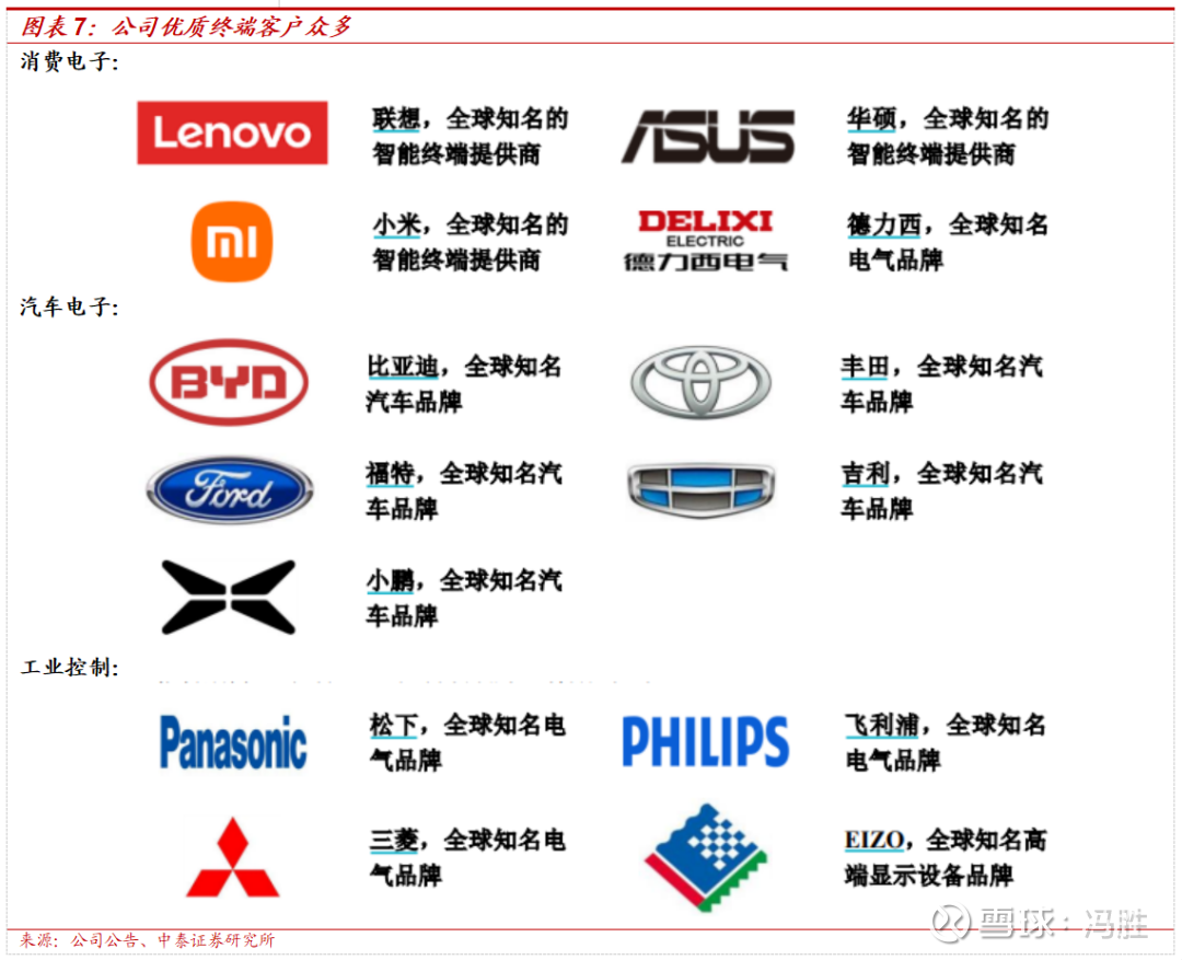 ◼ 公司终端客户多为各领域领先企业。公司具备优质的客户基础,终端客户多为各行业领先企业,如消费电子的联想、小米,汽车电子的比亚迪、福特、小鹏,工业控制的松下、三菱等。