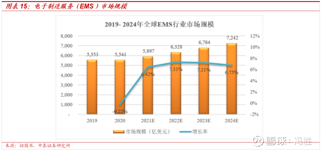 ◼ 全球EMS行业市场规模持续提升。随着 EMS 模式的日益成熟和行业内企业服务能力的不断提升,全球 EMS 行业呈现出服务领域越来越广、业务总量整体上升的发展趋势,根据 New Venture Research 数据,2020年全球EMS行业市场规模为5,541亿美元,预计2024年全球EMS行业市场规模达到7,242亿美元,2020-2024年CAGR为7%。未来,在下游终端应用领域需求旺盛及全球专业化分工的背景下,全球 EMS 行业将持续发展。