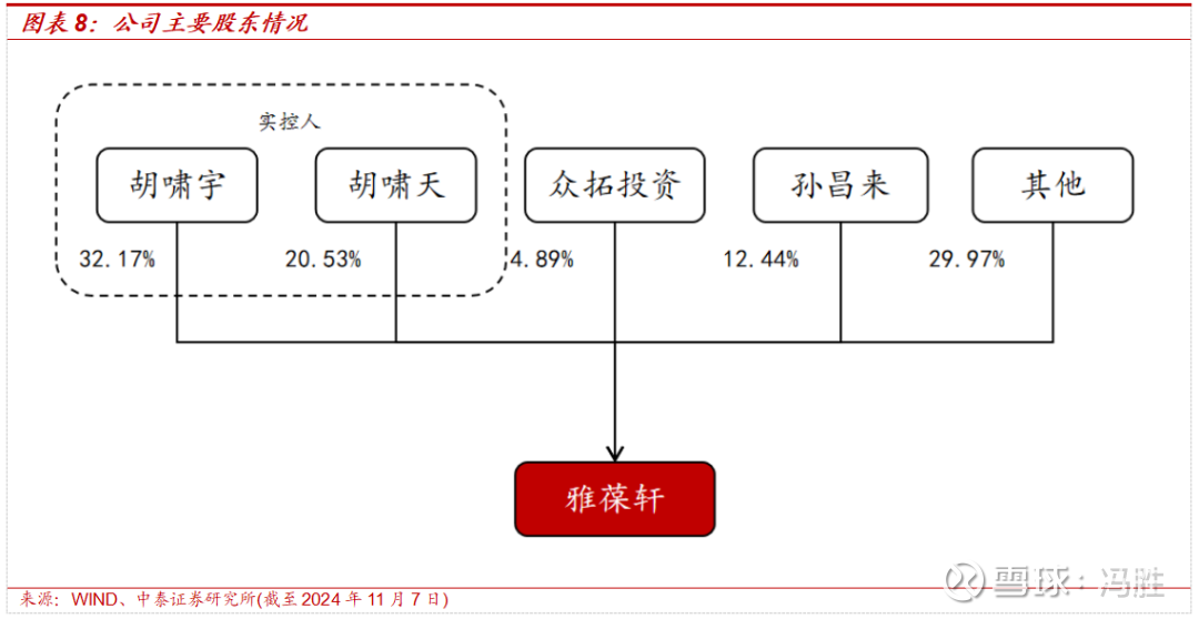 ◼ 公司实控人为胡啸宇、胡啸天兄弟,股权结构稳定。截至2024年三季报,董事长胡啸宇先生持有公司32.17%的股权,其同胞兄弟胡啸天持有公司20.53%的股权,此外二人通过众拓投资持有公司4.89%的股权,因此二人作为一致行动人合计持有公司57.59% 的股权。