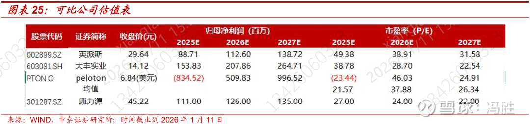 ◼因英派斯、大丰实业、Peloton等3家公司的业务模式、产品种类和公司较为相似,销售渠道也多有重合,故选取3家公司为康力源的可比公司。根据业务拆分及盈利预测模型,我们预计2025-2027年公司归母净利润为1.11/1.26/1.35 亿元,当前股价对应PE分别为27/24/22倍。公司新增马来西亚产能投放并实现规模效应后,生产效率进一步提升,人工成本逐步降低,整体盈利能力逐步稳定。我们看好公司的长期发展,结合可比公司平均估值水平,首次覆盖,给予“增持”评级。