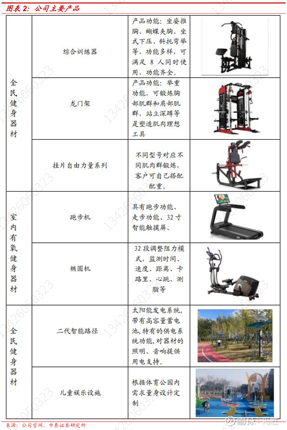 ◼公司是一家专注于健身器材研发、制造与销售的高新技术企业,以综合训练 器和自由力量训练器为主导、无氧与有氧结合、室内与室外结合、家用与商用结合的综合性健身器材业务体系。公司主要产品覆盖无氧类健身器材:固定力量训练器械和自由力量训练器械;有氧类健身器材:跑步机、椭圆机、健身车、划船机等;全民健身类器械,主要用于公园、居民小区等设施建设。