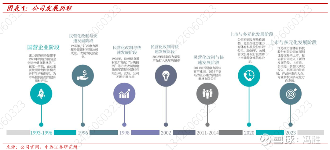 ◼民营化改制与快速发展阶段(1996年-2020年):1996年,江苏康力源健 身器器材有限公司成立,改制为民营企业。1998年,徐州健身器材总厂通过“分块搞活”等方式改制组建徐州军霞健身器材有限公司。此后,公司不断拓展市场,2002年以家庭力量型产品打入沃尔玛超市,2011年兴建康力源体育产业园,2014年更名为江苏康力源健身器材有限公司,2020年,公司根据发展战略调整,更名为江苏康力源体育科技股份有限公司。