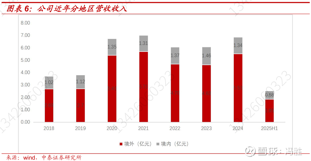 ◼公司2020-2024年营收收入主要以境外为主,境外收入5年来均保持在4.5亿元以上,总收入占比均超过75%。2024年实现境外收入5.53亿元,境内收入1.34亿元,境外收入占总收入80.45%。2025年H1境外收入1.85 亿元,占总收入73.12%;境内收入0.68亿元,同比提升7.12%。