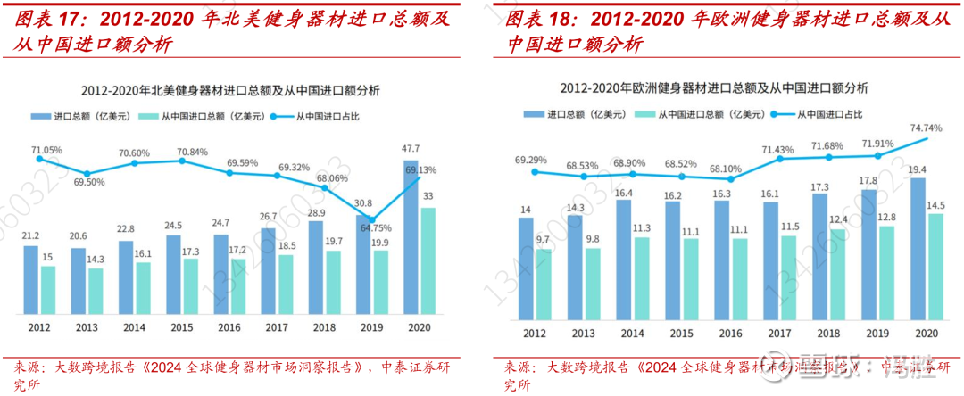 ◼中国是欧美健身器材市场的最大进口来源。。依托供应链与成本优势,中国已经成为健身器材出口大国。根据海关总署数据,2017-2021中国健身器材出口总值年复合增长率为32.88%。北美地区是全球最大的健身器材消费市场,产品主要来自进口,从中国进口健身器材的贸易额从2012年的15亿美元增长到2020年的33亿美元,总额占比在七成左右。2021年,我国健身器材出口金额前三的地区为美国、德国和英国,出口金额占比分别为33.5%、5.4%和 4.9%。
