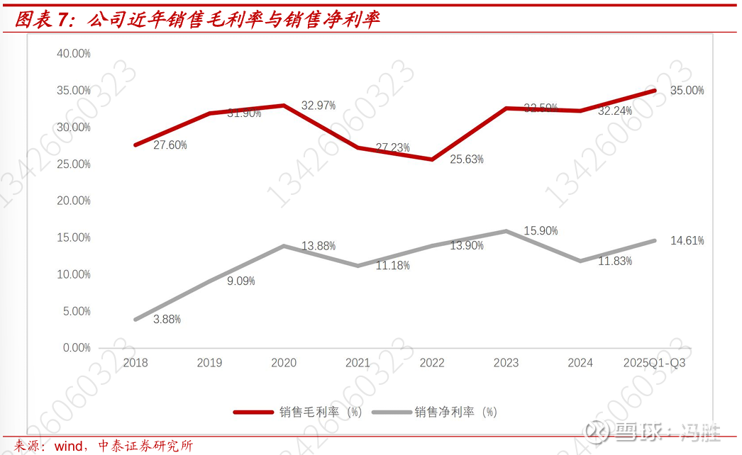 ◼公司毛利率触底回升,盈利空间具有较强韧性。2019-2020年毛利率稳定在31%-33%的高位,产品成本与定价的平衡能力较好,2021-2022年受成本上涨、低毛利产品占比提升等因素影响,毛利率下滑至25%-27%;2023-2024年则通过成本管控优化、高毛利智能产品占比提升,重回32.24%,盈利空间快速回升。2025Q1-Q3继续保持上升趋势,毛利率为35%。
