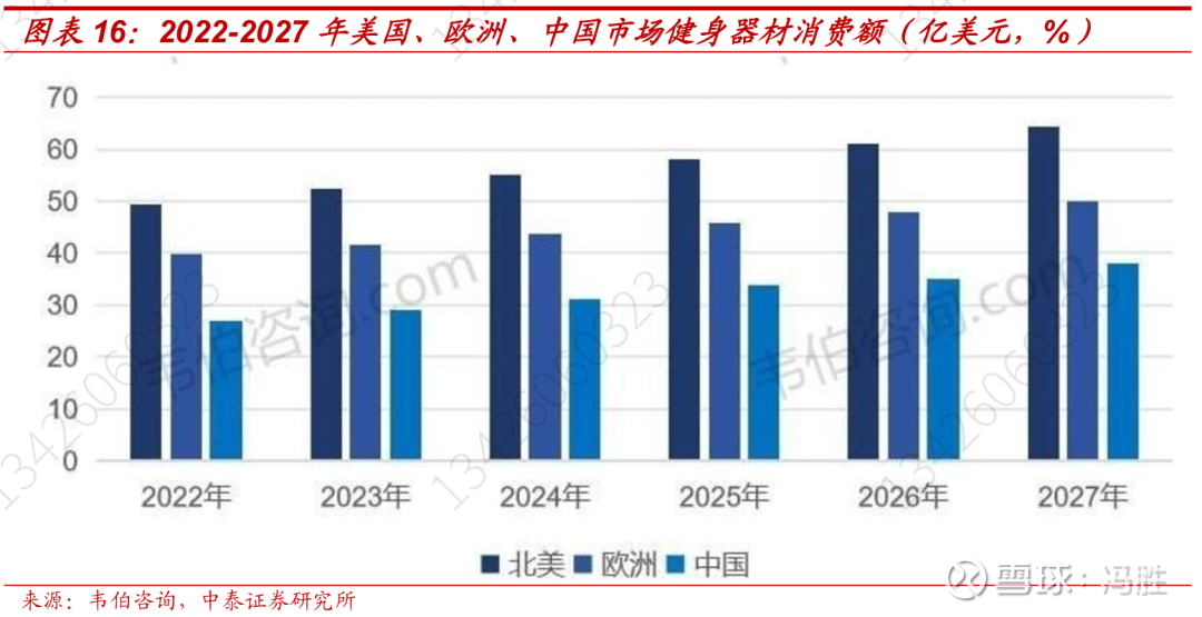 ◼全球健身器材主要消费市场是美国和欧洲。美国、欧洲健身产业起步较早,健身器材消费市场规模处于全球领先地位。国际产业分工格局是以亚洲为 要制造地,欧美等国家主要输出技术,购买发展中国家制造的产品。根据韦伯产业咨询,2022年北美市场健身器材消费额为49.43亿美元,欧洲市场健身器材消费额为39.9亿美元,中国市场健身器材消费额为27.1亿美元。预计到2027年,北美、欧洲和中国市场健身器材消费额将分别达到64.39亿美元、49.88亿美元和37.91亿美元。