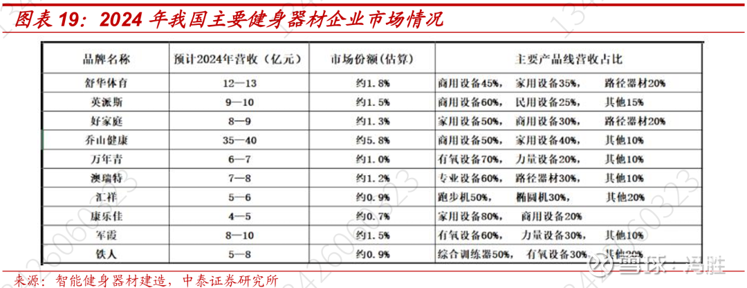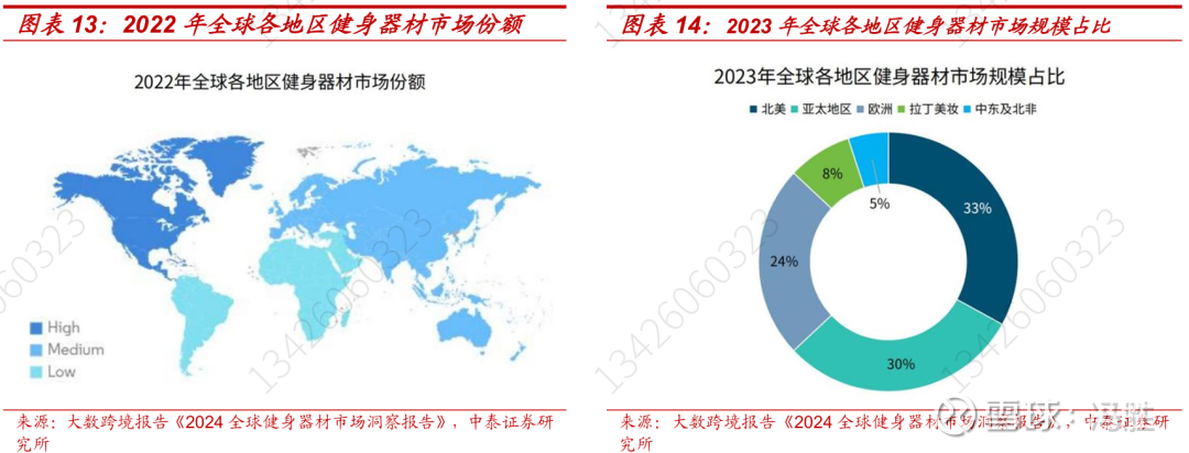 ◼欧美为主要消费市场,中国市场更具增长潜力。。2023年,北美以33%的市场份额位居全球健身器材市场首位,主要得益于消费者对健康意识的提升和健康生活方式的采纳,特别是在有氧训练器材方面的需求,如动感单车、划船机和跑步机。亚太地区则预计成为增长最快的市场,增长动力来自健康意识的提升、可支配收入的增加以及对家庭健身解决方案的偏好。中国市场增长势头更为迅猛,预计2025年整体规模突破850亿元,核心驱动力是我国健身人口渗透率仅约5%,远低于美国的25%,蕴含巨大的追赶潜力。