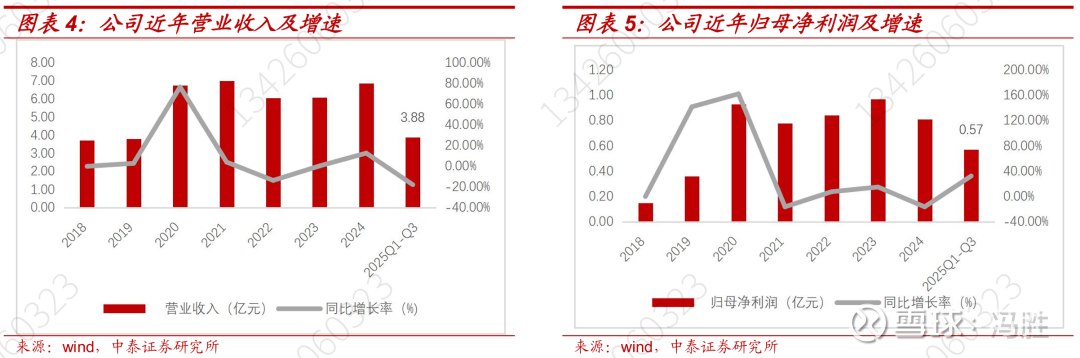 ◼公司营收整体稳定增长,近年来业绩亮眼。2022年起,公司营收和归母净 利润在波动中持续修复,2024年收入明显改善,2025年前三季度归母净利润同比大幅增长。2025年Q1-Q3,公司实现营业收入3.88亿元,同比减 少-17.78%,归母净利润0.57亿元,同比增长32.44%。其中。Q3实现收入1.35 亿元,同比-16.66%;归母净利润0.27亿元,同比+115.16%。