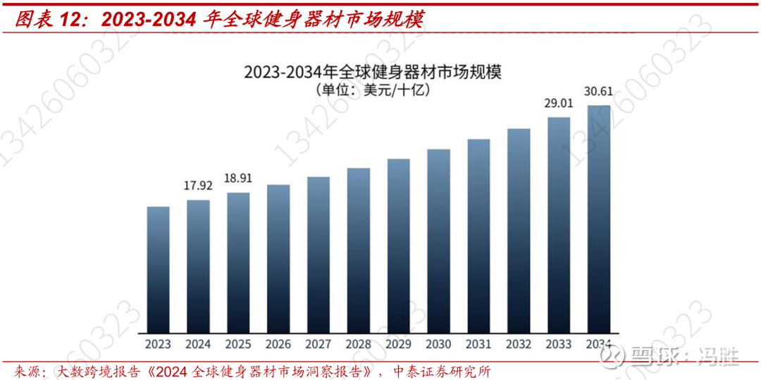 ◼全球健身器材市场呈现稳健增长态势。根据国家统计局分类,健身器材隶属于“C2443 健身器材制造”和“0914 健身器材制造”,这确定了行业受益于国家体育强国战略和制造业升级双重政策红利的地位。根据precedenceresearch,全球健身器材市场预计将从2024年的179.2亿美元稳步增长至2034年的306.1亿美元,年复合增长率(CAGR)约为5.5%。