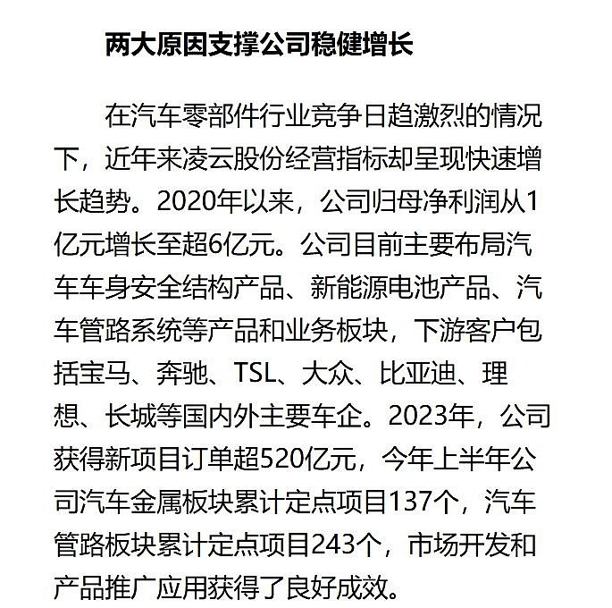 基本面很扎实,20PE不到,优质客户很多,特斯拉,华为,比亚迪,宝马,奔驰,保时捷等等,净利润这几年都在增长,从2020年的1亿到2024年的6亿,今年预计要超过7.5亿,对应现在总市值才不到150亿,关键是公司又进入了机器人和液冷的赛道,未来潜力十足。