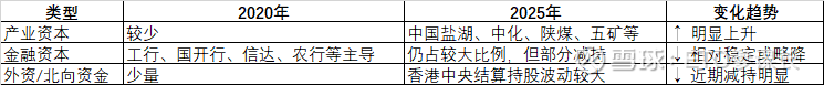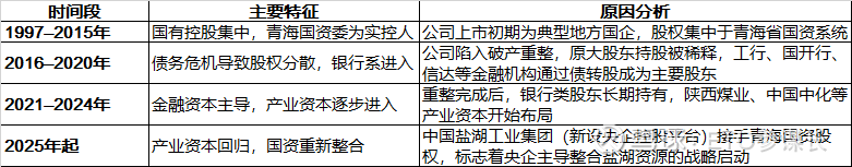 破产重整导致原国资股东股权稀释; 金融机构通过债转股成为主要股东; 2025年起央企主导整合,产业资本回归,标志着盐湖股份从“地方国企”向“央企主导的战略资源平台”转型。