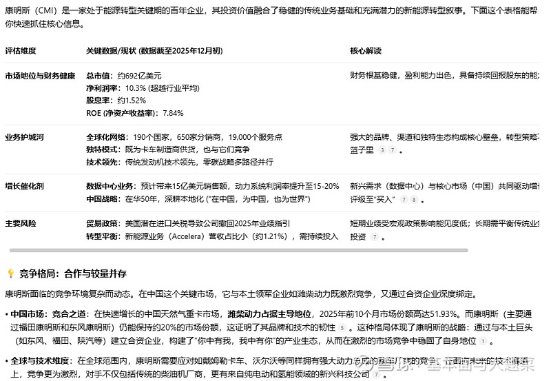 ·分析师核心问题回应:问答环节围绕发动机利润率、动力系统增长、电解器业务及关税影响展开。关于发动机业务2025年第四季度利润率,管理层表示受产量下降、工程预算高企(因2027年排放法规前新发动机平台研发投入)及成本压力等因素影响,预计不会出现大幅改善,但有望接近底部;不预期第四季度利润率低至8%。动力系统方面,第三季度增量利润率接近50%,主要因数据中心需求驱动,且公司通过产品精简、定价优化及适度产能扩张(约2亿美元)实现增长;第三季度订单创纪录,预计2025年数据中心相关收入同比增长30% 35%,2026年将继续投资以支撑盈利增长,但增量利润率持续提升的轨迹可能放缓。电解器业务方面,需求超预期下滑(美国及国际市场采用放缓)导致收入缺口,2025年实际表现与原指引差距显著,公司正评估战略调整(如成本削减)以降低亏损;而移动业务进展良好,已从高亏损、负毛利率转向更稳定可持续的状态。关税影响方面,2025年第三季度关税负面影响持续扩大,但通过价格调整等措施部分抵消,第四季度预计接近价格成本中性(仅覆盖前期已宣布关税);232关税具体细节(如退税机制)尚未明确,难以量化对2026年的财务影响,但公司凭借美国本土生产优势,有能力支持客户并应对不确定性。