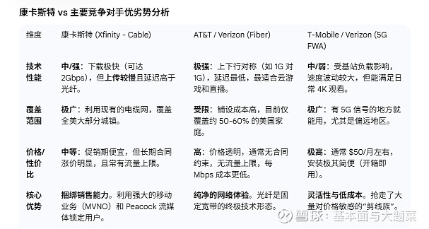 光纤渗透(Fiber-to-the-Home): AT&T 和 Verizon 等电信运营商正在大举铺设光纤,提供更对称的上传/下载速度,蚕食了康卡斯特的部分高端用户。