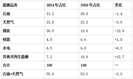 2050年全球能源总需求较2024年将整体增长23%,能源需求的增量并非由新能源单独填补,而是新能源与传统能源共同增长——这是市场最易忽视的核心逻辑。从能源结构占比来看,石油仍是全球占比最高的单一能源品种,2024年占比31.2%,2050年降至29.8%,会下降1.4个百分点,全球原油需求将从2024年的约1.03亿桶/日,增长至2050年的1.2亿桶/日。