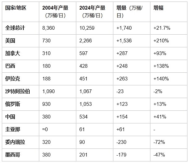2004年全球石油产量8360万桶/日,2024年增至1.03亿桶/日,20年增量1740万桶/日。其中美国石油产量从730万桶/日增至2266万桶/日,增量1536万桶/日,贡献了全球80%的产量增量,俄罗斯、中国、加拿大等国的增量均相对有限,部分国家如委内瑞拉、墨西哥甚至出现产量大幅下滑。