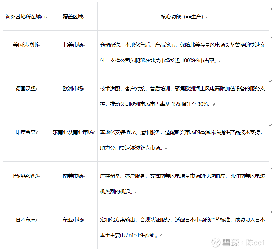 公司在全球风电核心市场布局了多个服务型基地,以“本地化服务”打破地理壁垒,保障海外订单的高效交付与运维。这些基地虽不承担生产职能,但成为海外业务增长的重要支点,具体分布及功能如下: