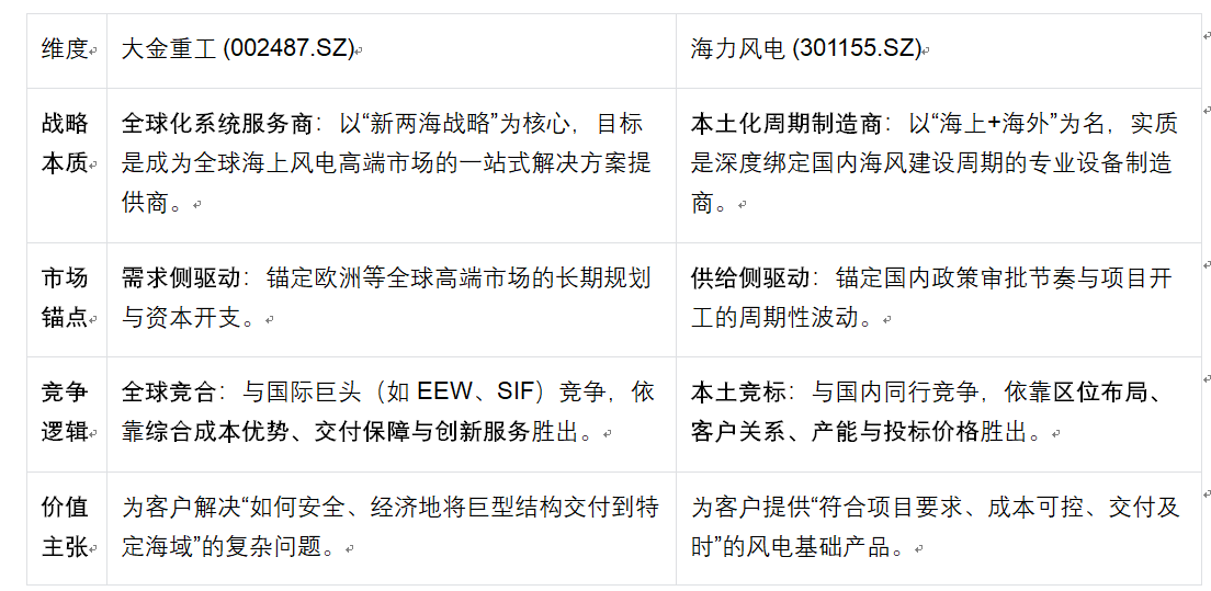 分析:两者的战略根源不同。大金重工是 “由外而内” 的战略,先锁定全球最成熟、最溢价的市场(欧洲),再反向构建与之匹配的极限能力。海力风电是 “由内而外” 的战略,依托中国这一全球最大单一市场的需求成长,不断强化规模与配套优势。这一定位差异,从根本上塑造了二者完全不同的竞争力构建方向。