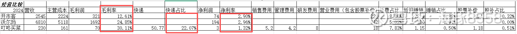 跟超市巨头们比较一下,毛利率更高,只是快递费占成本很大,但固定资产投入少很多,毕竟弄个前置仓不需要像商场那样装修,况且实际毛利少些也不成问题,能赚钱能给消费者提供价值就行。世界上有三种好的商业模式,一种茅台,高毛利;一种银行,高杠杆;一种沃尔玛,高周转率。叮咚买菜符合第三种,用十几亿的钱一年能做200多亿的生意,不怕单笔毛利低,零售买菜不停地复购照样搞出像样的毛利率。