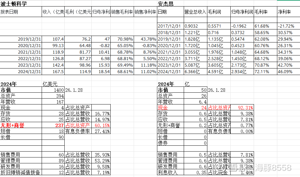 安杰思成立以来年销售额和利润快速成长,2017年销售额0.9亿,2024年6.3亿,复合增长率CAGR达到32%,且毛利率净利率并不下降,毛利率7成,净利率维持在40%左右。但这才是万里长征的第一步,举例来说全球内镜诊疗领域波士顿科学市占36%,奥林巴斯34%,库克13%,其他所有才17%,安杰思也只是在这个17%里的一个,所以增长空间还大的很,远没到天花板。下图做了个波士顿科学和安杰思的简单比较,虽然体量差别很大,但安杰思高速成长而且管理成本和销售费用控制优秀得多的多,波士顿就显得很臃肿,吃得多拉得多,并且大量靠并购而不是自身增长。