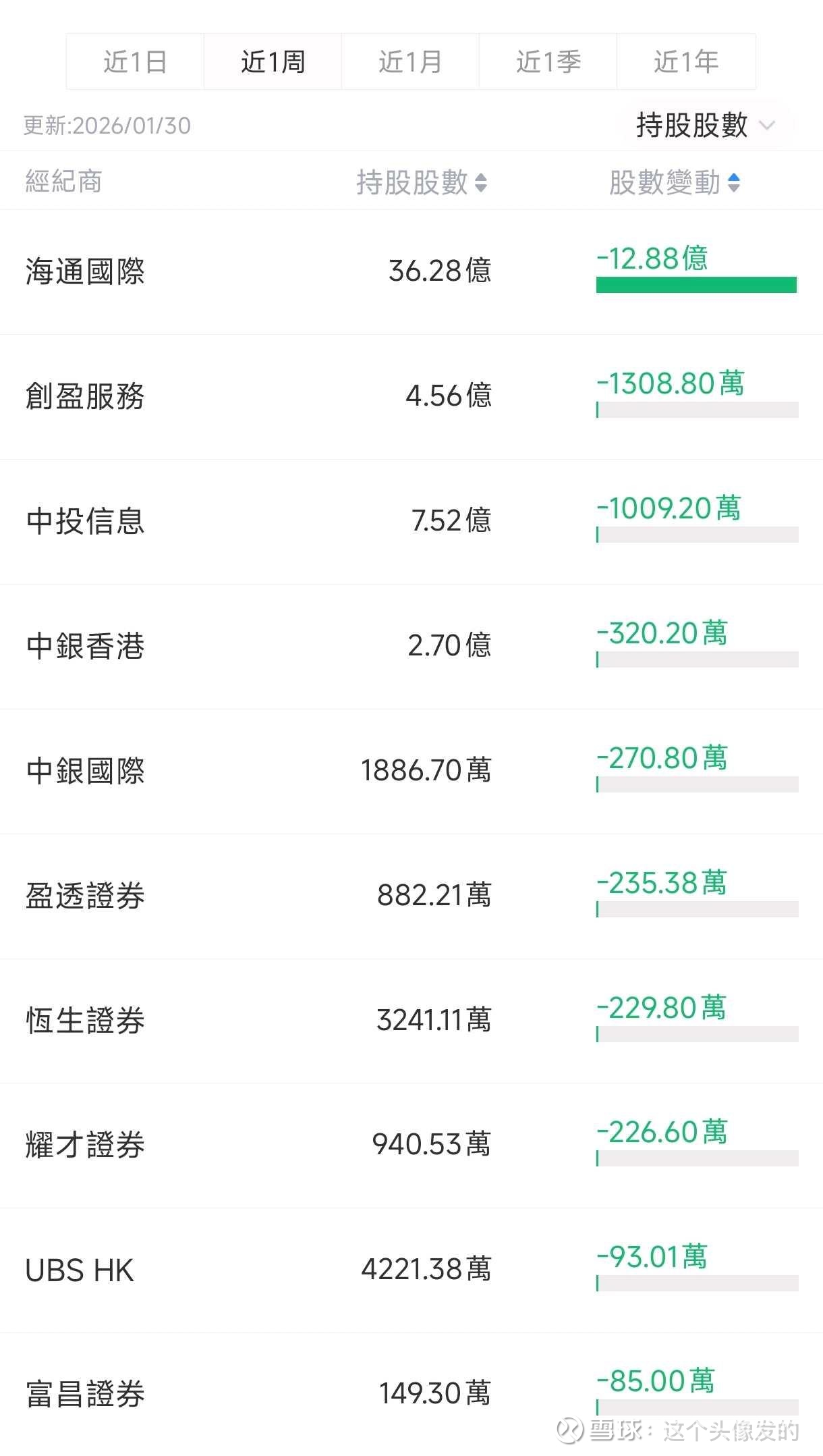 e. 港股通持股环比上周同期减少约2318万股,最新持股减少至约12.07亿股,持股比例下降至约4.62%。
